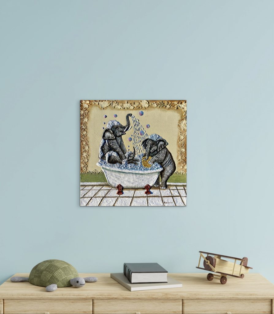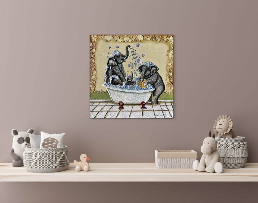 “Bubbles of Love” is an original 3D textured oil painting that captures a tender and joyful moment of family connection. A loving elephant family shares a playful bath, surrounded by soft foam and floating bubbles that add lightness and movement to the scene. The composition radiates warmth, care, and the simple happiness of being together.