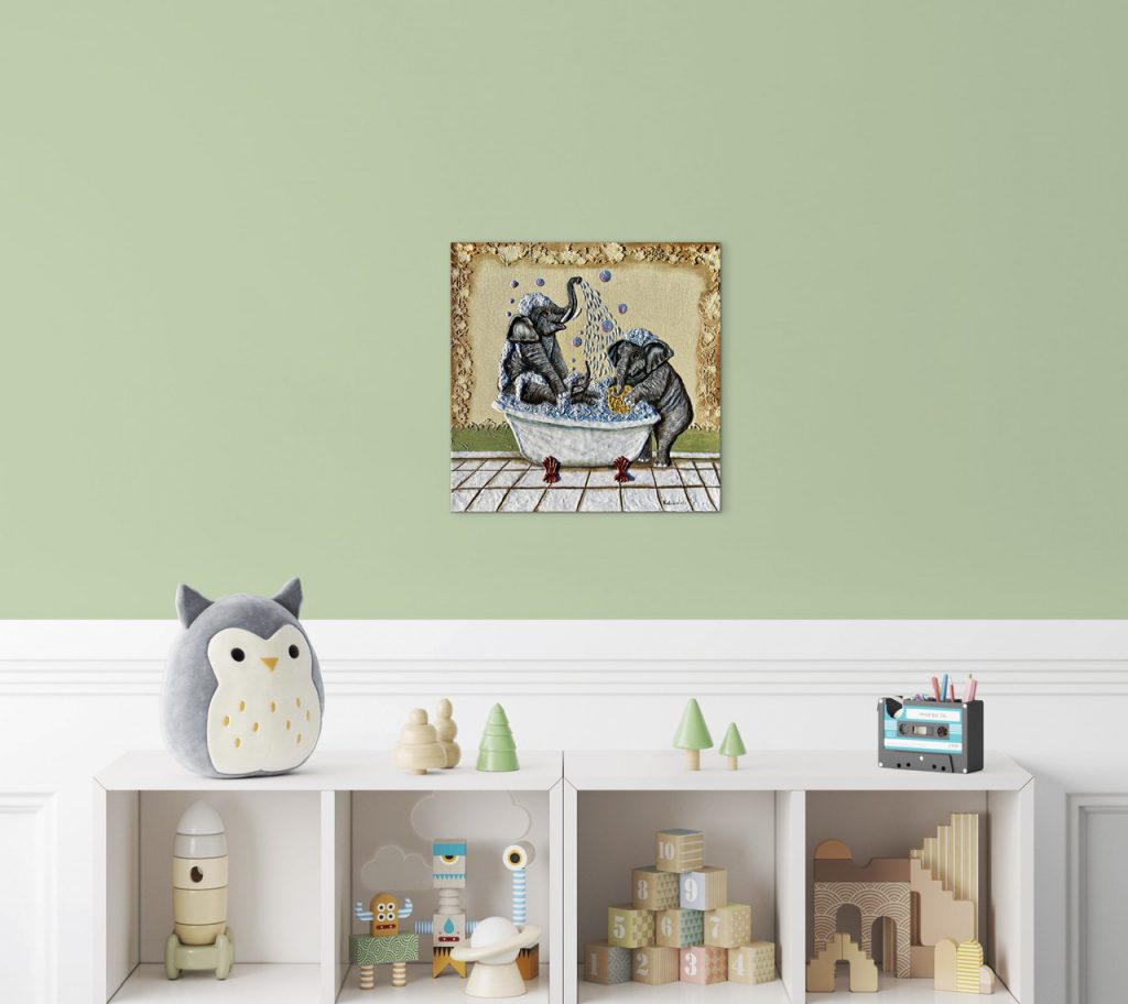 Created using sculptural texture paste and layered oil paints, this artwork has a pronounced three-dimensional surface. The raised textures bring the elephants, water, and bubbles gently forward, inviting both visual and tactile engagement. Soft neutral tones, calming blues, and subtle decorative details create a cozy, harmonious atmosphere.