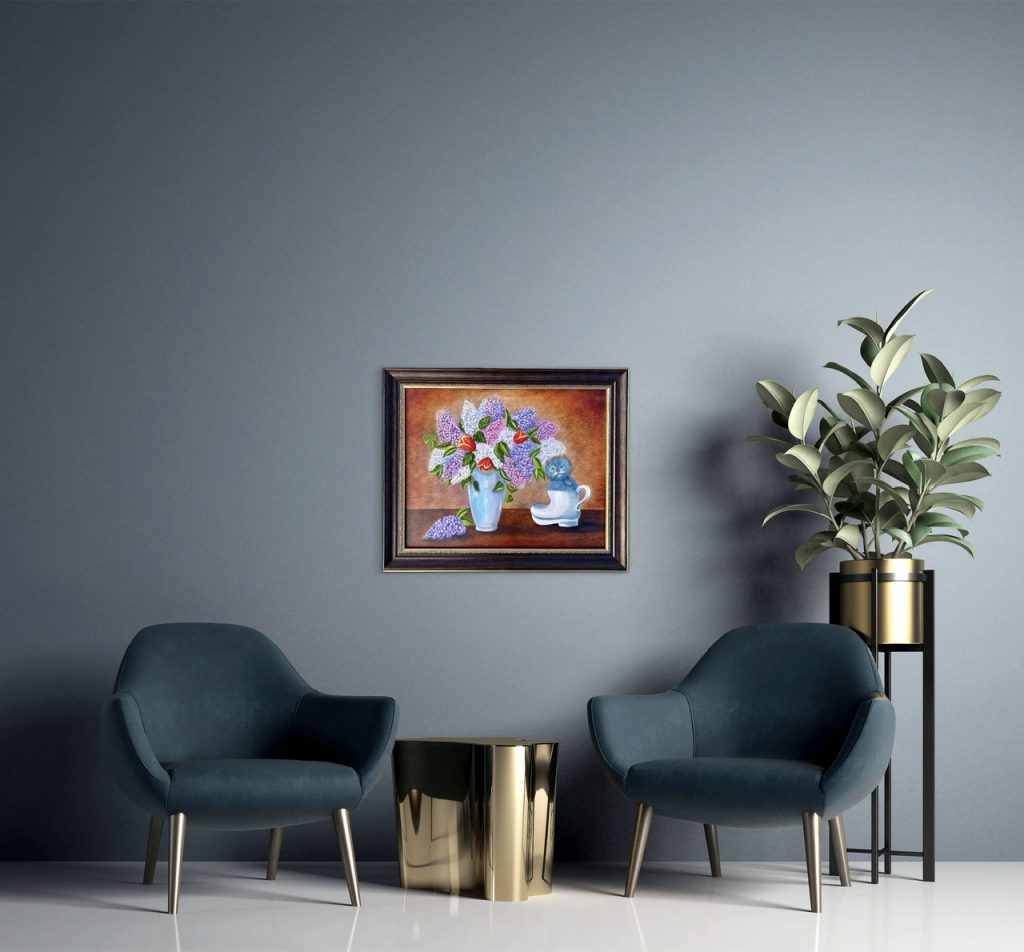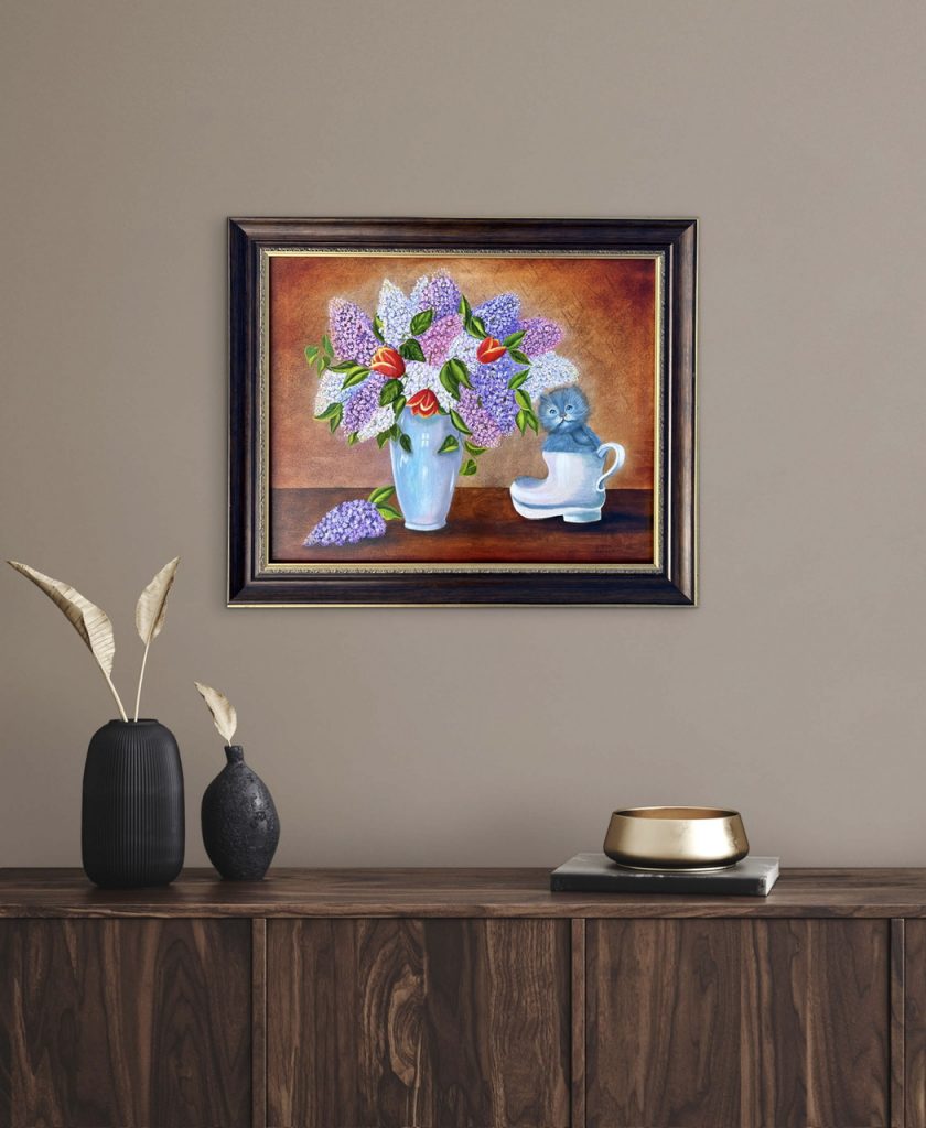 “Fluffy Spring” is an original oil on canvas painting that celebrates the tenderness and freshness of spring. Inspired by blooming lilacs and the gentle beauty of nature, this artwork combines delicate floral textures with a playful, heartwarming element—a fluffy kitten nestled inside a whimsical teacup. The contrast between the soft pastel flowers and the warm earthy background creates harmony and depth. This piece reflects a sense of comfort, joy, and quiet happiness, inviting the viewer into a peaceful, dreamlike moment. The detailed brushwork and subtle color transitions bring both realism and a touch of imagination to the composition.