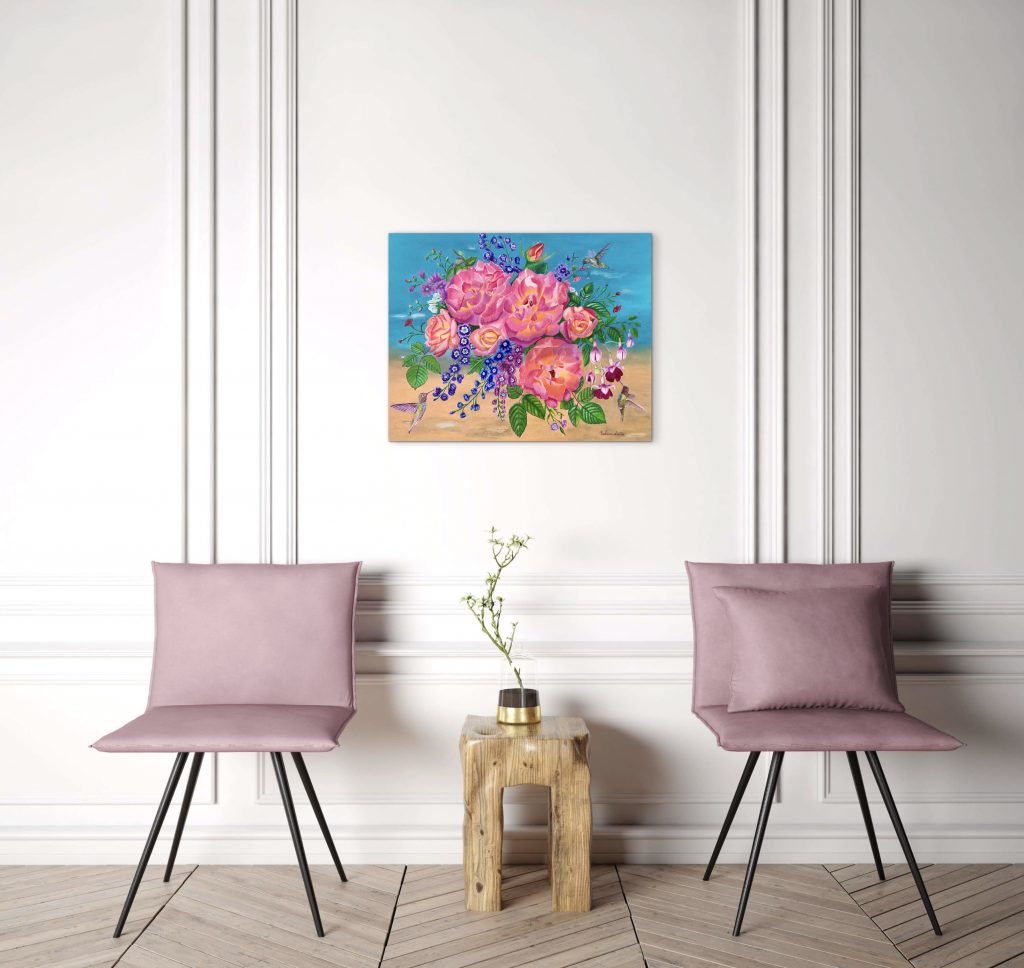Harmony in Flight” is an original, hand-painted oil on canvas artwork enriched with subtle 3D texture, celebrating the poetry of nature in motion. Lush pink roses bloom against a radiant turquoise sky, surrounded by delicate violet blossoms and vibrant green foliage. Graceful hummingbirds hover and dance among the flowers, symbolizing joy, freedom, and the delicate balance of life.