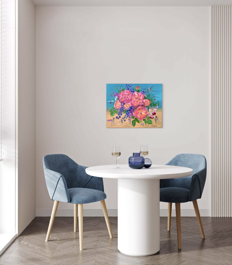 This artwork radiates harmony, love, and optimism, making it a perfect statement piece for refined interiors — from coastal and contemporary spaces to elegant classic homes. A one-of-a-kind painting created to uplift the spirit and bring nature’s music indoors.