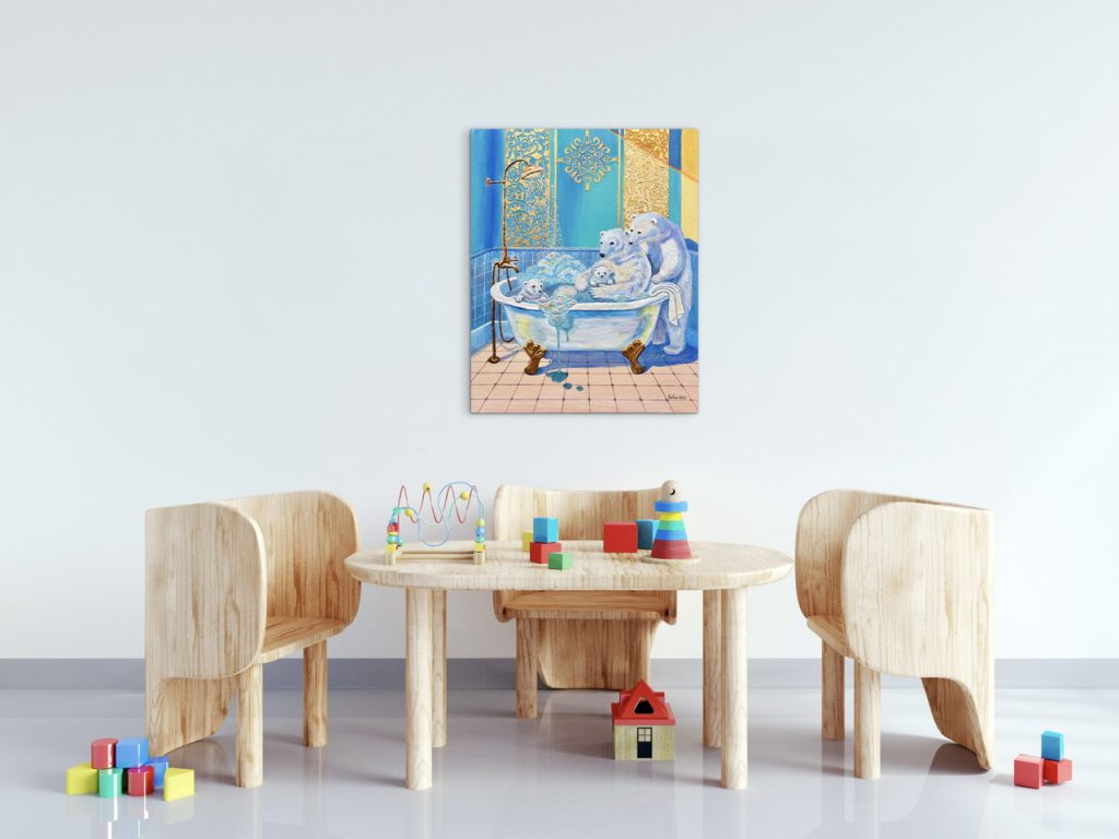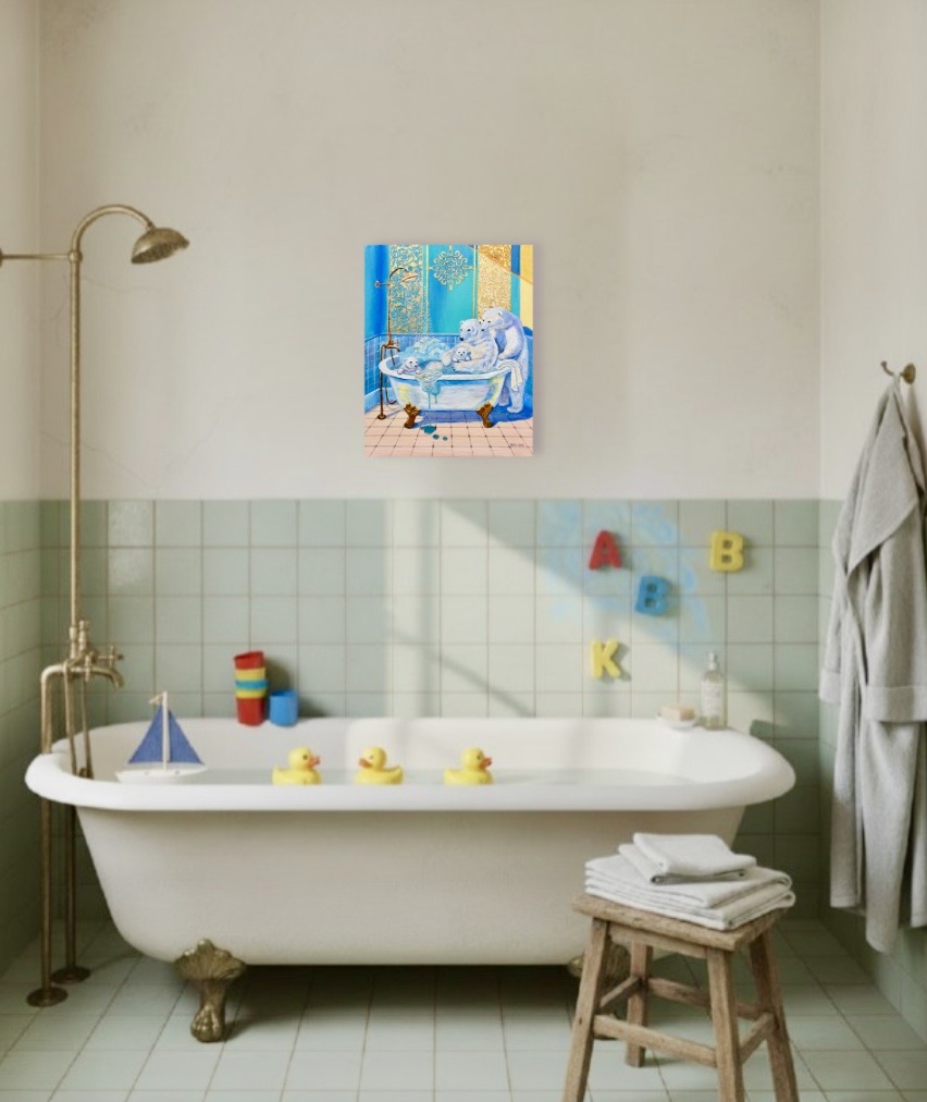 Held by Love is an original 3D textured mixed media painting from my Bath Time Stories collection. The artwork captures a tender bath-time moment of a polar bear family, where warmth, protection, and affection surround the little cubs. This gentle scene celebrates childhood, trust, and the quiet beauty of being cared for.